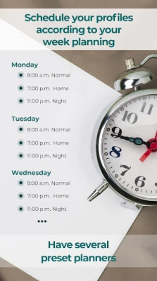 You can also schedule the profiles to be automatically activated at specific times according to your week planning. For example, at 6:00 am activate Loud, at 8:00 pm activate Silent.