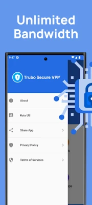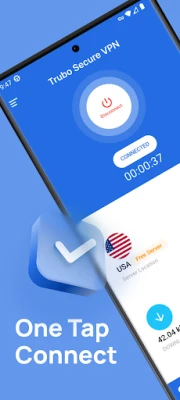 One tap to connect to a free VPN proxy server. Check the Download and Upload speed on the screen. Turbo secure VPN works with WiFi, LTE, 3G, and all mobile data carriers. Download the secure, fast and free Turbo secure VPN! Secure your online activities and enjoy your favorite sites now!